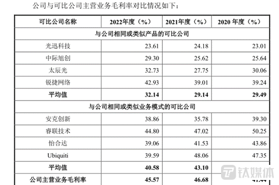 钛媒体APP注意到,飞速创新的产品似乎在境外可以赚到更多的钱。报告期内,飞速创新的毛利率分别为41.44%、46.68%、45.57%,同行可比公司毛利率的情况具体如下: