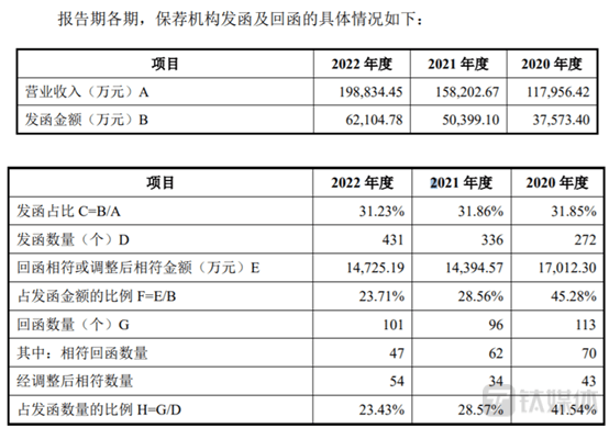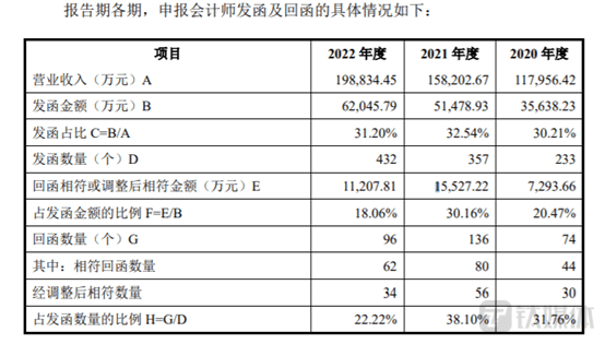 值得一提的是,中介机构仅对飞速创新销售额30%的客户全部发函,而剩余70%进行随机抽样。最终,保荐机构发函金额分别为37573.4万元、50399.1万元、62104.78万元,分别占当期营业收入的31.85%、31.86%、31.23%,回函相符金额占发函金额比例分别为45.28%、28.56%、23.71%;申报会计师发函金额分别为35638.23万元、51478.93万元、62045.79万元,分别占当期营业收入的30.21%、32.54%、31.2%,回函相符金额占发函金额比例分别为20.47%、30.16%、18.06%。