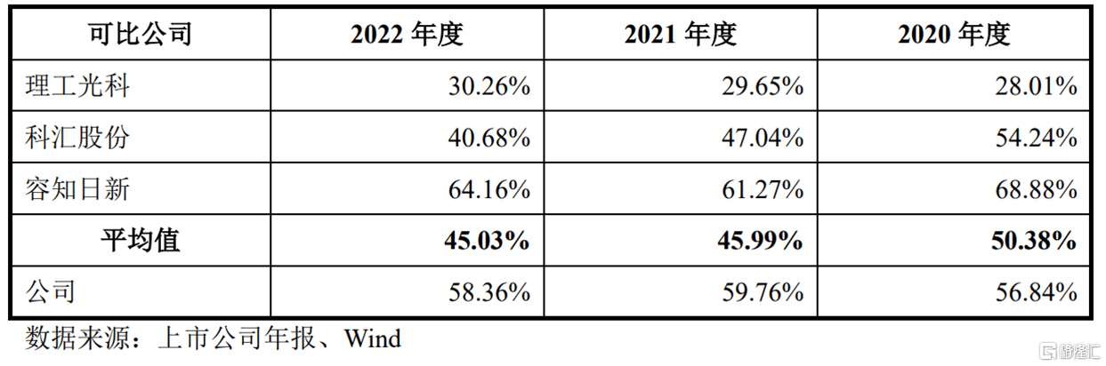 报告期内,公司主营业务毛利率分别为56.84%、59.76%和58.36%,存在小幅波动,在可比上市公司中,低于容知日新,高于理工光科、科汇股份。
