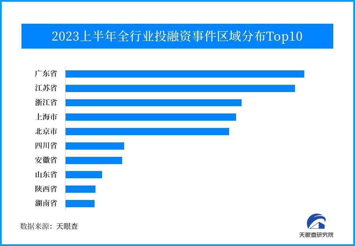 从2023年上半年数据来看,广东、江苏、浙江、上海以及北京,五个区域融资数量位居,分别拥有720余起、700起、530余起、520余起以及500起。