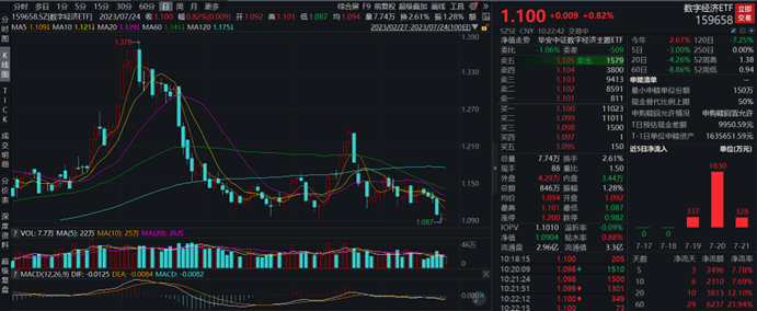 截至10:22,数字经济ETF华安(159658)早盘震荡反弹,现上涨0.82%,成交额持续扩大,市场交投活跃,连续3日获资金净流入。