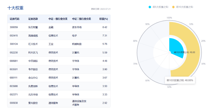 数据显示,截至2023年7月21日,该指数前十大权重股包括东方财富、海康威视、汇川技术、科大讯飞、中芯国际等,前十大之和为48.88%。(数据来源:中证指数公司,指数成份股不代表个股推荐)