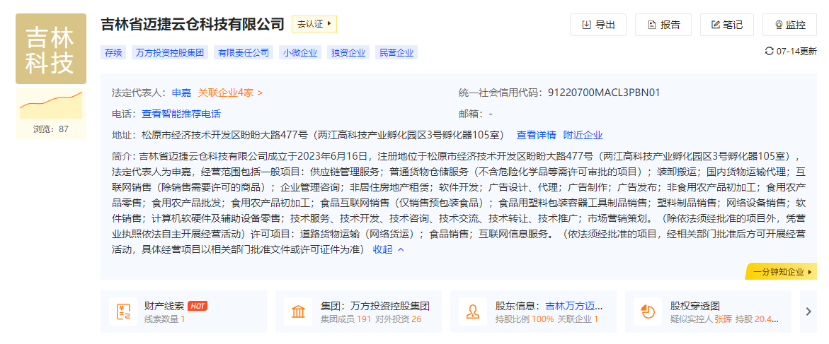 近日,据启信宝APP显示,吉林省迈捷云仓科技有限公司(以下简称迈捷云仓)正式成立。