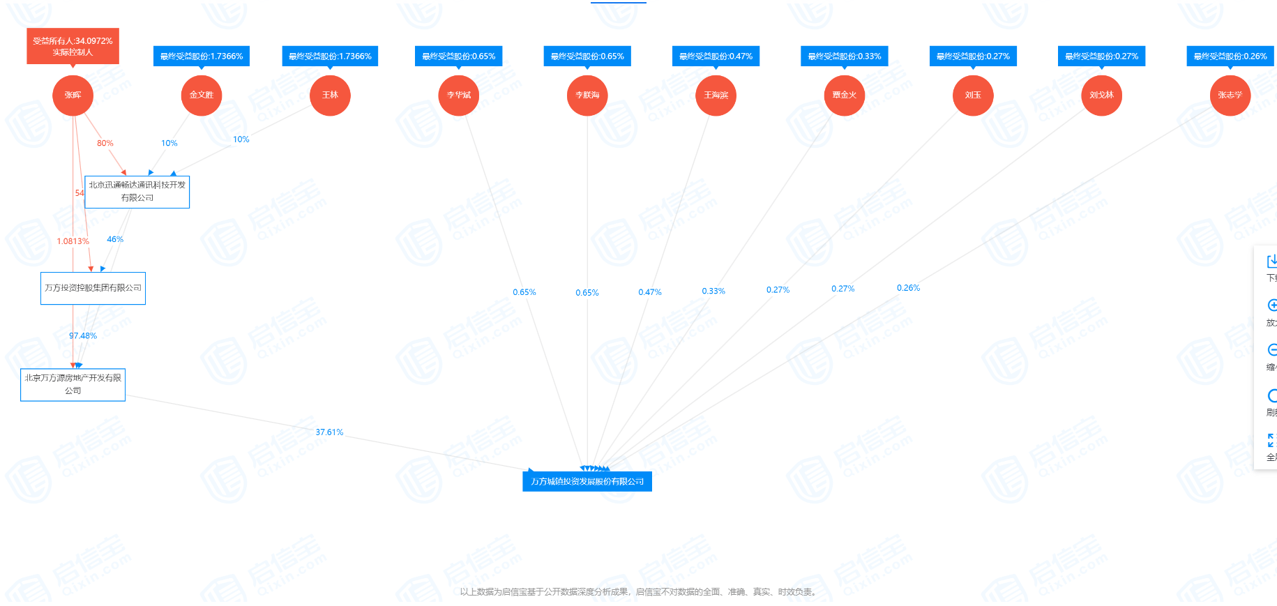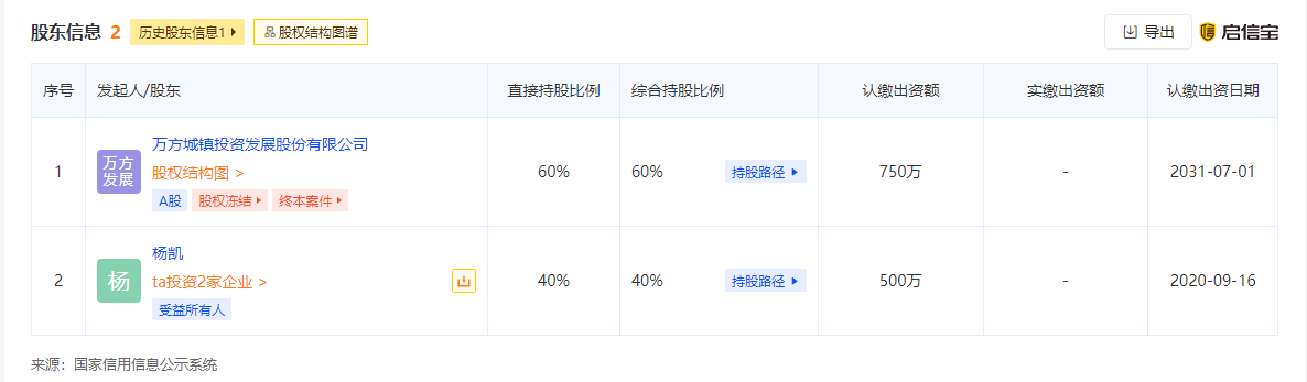 根据启信宝APP股权穿透显示,该公司由万方城镇投资发展股份有限公司(以下简称万方发展)和杨凯间接共同持股。