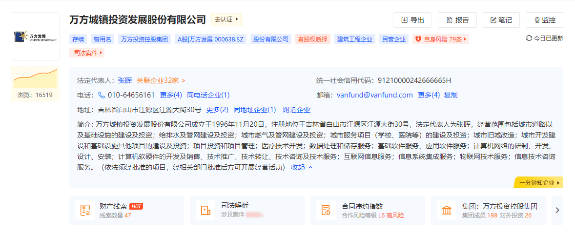 而万方发展是一家在深圳证券交易所挂牌交易的A股上市公司,成立于1996年11月20日,注册资本30940万元人民币。 公司主要从事土地一级整理和开发、医疗信息化软件研发与销售、互联网医疗、智慧医院、互联网药店O2O平台运营等业务。 公司目前拥有主营土地一级开发的北京万方天润城镇基础建设投资有限公司、香河东润城市投资有限公司、沧州广润城市建设投资有限公司等多家子公司。