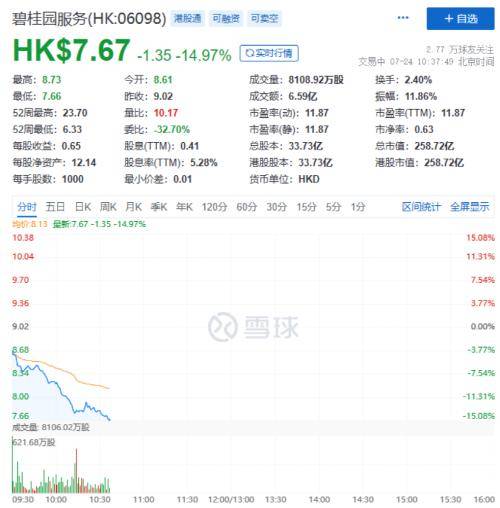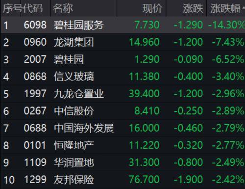 港股市场上,碧桂园服务跳水跌近15%,碧桂园一度跌超7%,龙湖集团、新城发展、九龙仓置业等多只地产股跌幅居前。