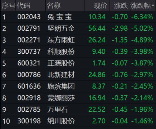 地产股不振,建材板块同步走低。上午兔宝宝、坚朗五金、东方雨虹、科顺股份等多个股跌幅居前。