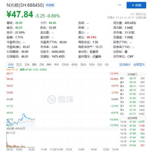 科创板的光格科技,发行价格53.09元/股,发行市盈率为52.21倍。上午以48元/股的价格低开,盘中最低价为46.01元/股,中一签最多赔3540元。