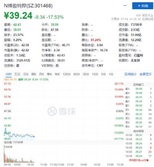 创业板的博盈特焊,此前发行价格47.58元/股,发行市盈率为54.12倍。今日开盘,博盈特焊低开39.99元/股,跌近16%。截至发稿,博盈特焊股价最低达到38.01,跌超20%。如操作不当,中一签最多将赔4785元。