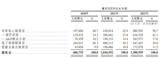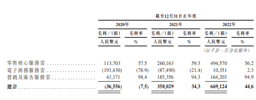 2021年,多点第一大业务为电子商务云业务,但由于毛利率过低,多点开始把重心转向零售服务云业务。数据显示,2022年零售服务云毛利率为56.2%,电子商务云则为2.3%。