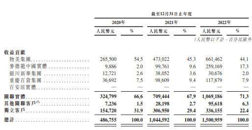 招股书显示,多点第一大客户为公司股东物美超市,报告期内来自物美集团贡献的收入分别为2.66亿元、4.73亿元、6.61亿元,分别占公司总收入比例为54.5%、45.3%、44.1%。