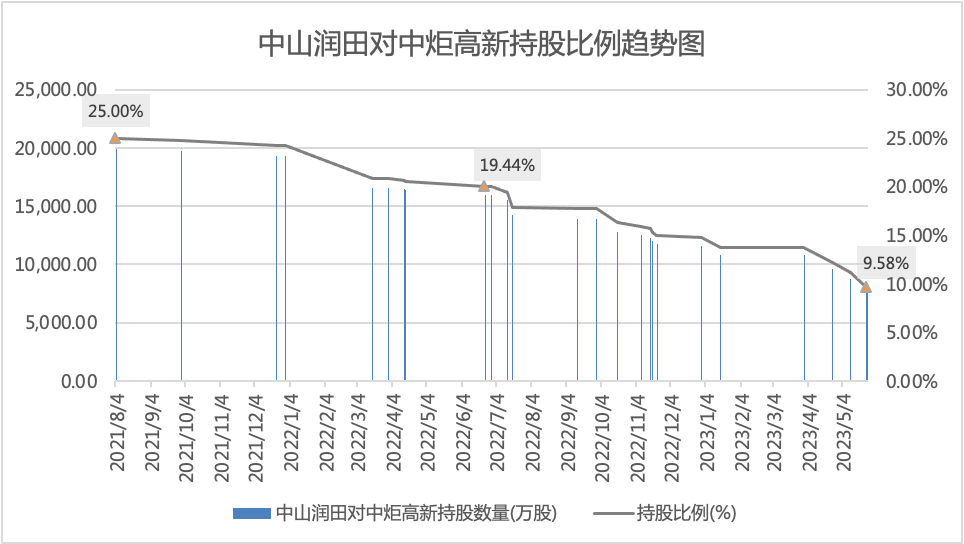 2022年一季度开始,宝能系由于债务问题根基松动,中山润田持有的中炬高新股份被陆续拍卖、划转,中山润田对中炬高新的持股比例也从高峰时期的25%一路降至2023年5月26日的9.58%。