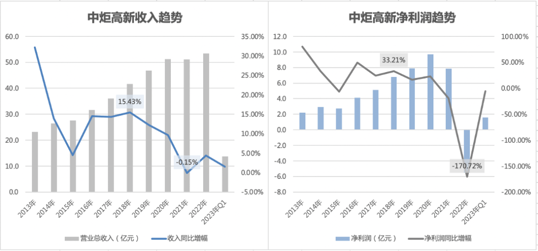 数据显示,自2019年姚振华成为中炬高新实际控制人以来,其收入和净利润的增长幅度就开始显著放缓,其中2021年和2022年,中炬高新的收入同比增幅分别只有-0.15%和4.41%,均为近十年来最低,2022年更是出现5.55亿元的上市以来首亏,最新业绩预告显示,2023年上半年还将有14亿元左右的巨额亏损。