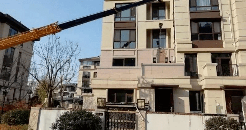 随着吊钩拖起洗衣机包装箱,它被小心翼翼地从阳台上吊运到了用户的家中。