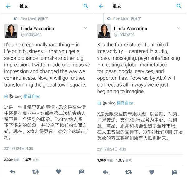 “这种转变绝对没有限制。X将是一个可以交付....一切的平台。马斯克和我期待着与我们的团队和每一位合作伙伴一起将X带到世界上。”