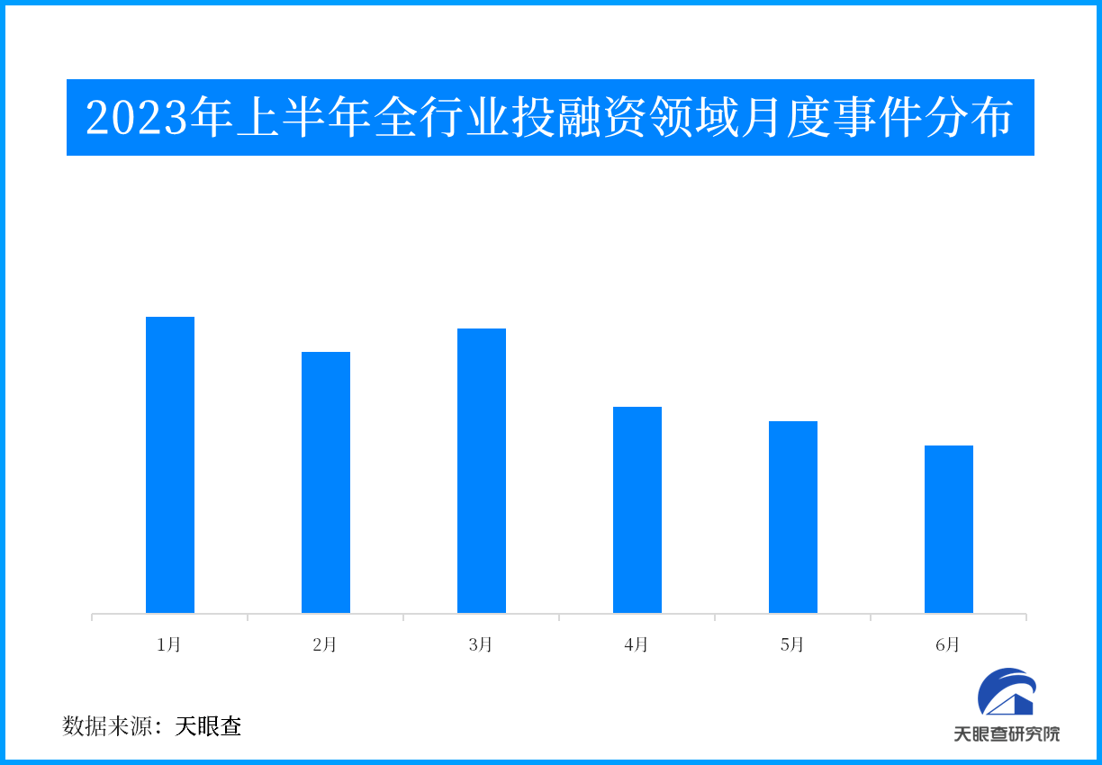 从2023年上半年月度数据分布来看,1月、2月以及3月,相关融资事件数位居前列,分别拥有870余起、760余起以及830余起。
