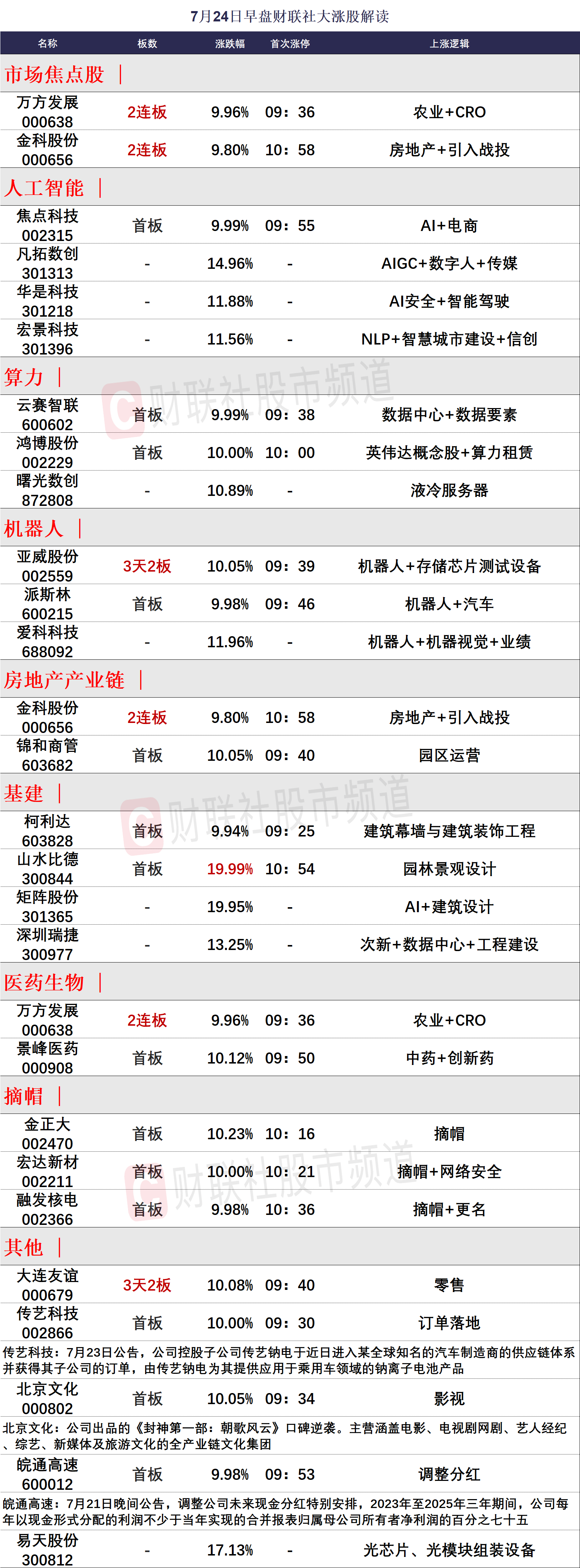【7月24日午间涨停分析】今日午盘两市共18股涨停,连板股总数2只,17股封板未遂,封板率为51%(不含ST股、退市股及未开板新股)。个股方面,地产股金科股份2板,农业+医药的万方发展2板,零售股大连友谊3天2板,机器人概念股亚威股份3天2板。
