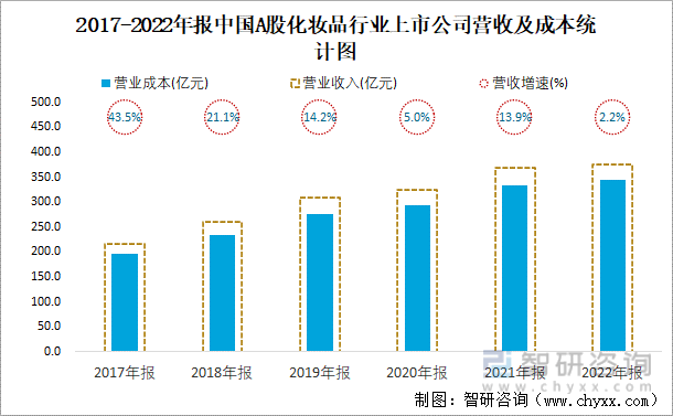2017-2022年报中国A股化妆品行业上市公司营收及成本统计图