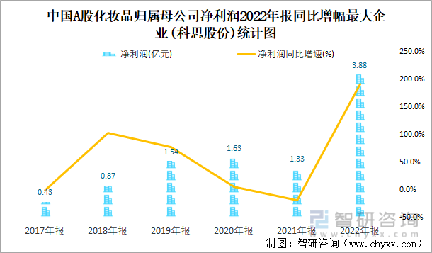 中国A股化妆品归属母公司净利润2022年报同比增幅最大企业(科思股份)统计图