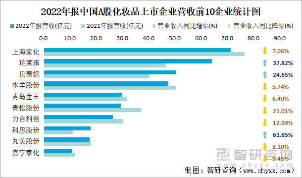 2022年报中国A股化妆品上市企业营收前10企业统计图