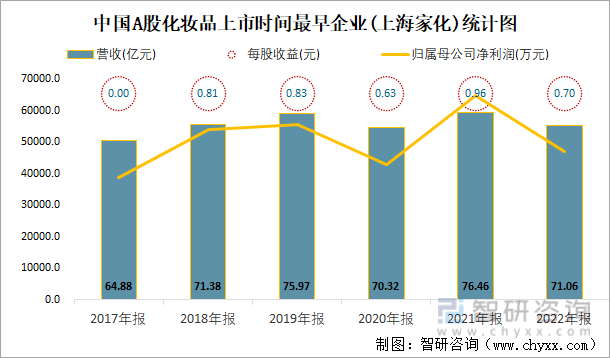 2022年报中国A股化妆品上市公司中,截至2023年5月31日,2001年3月15日上市的上海家化上市时间最早距今约22年,从近几年年报营收与净利润来看,2021年报营收最高,有76.46亿元。