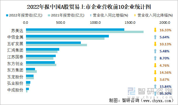 2022年报中国A股贸易上市企业营收前10企业统计图