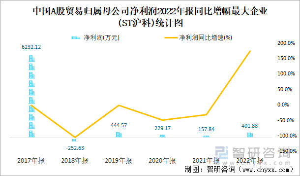 中国A股贸易归属母公司净利润2022年报同比增幅最大企业(ST沪科)统计图