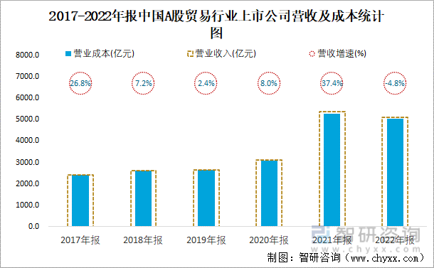 2017-2022年报中国A股贸易行业上市公司营收及成本统计图
