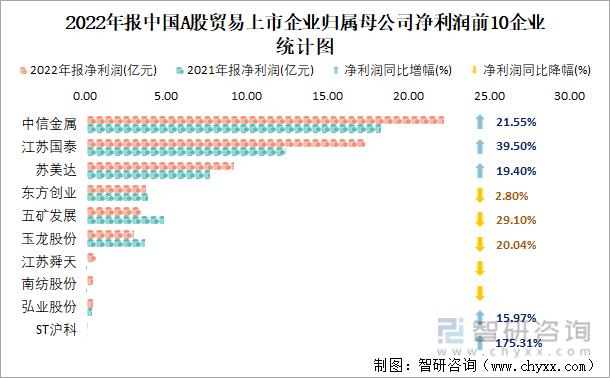 2022年报中国A股贸易上市公司中,中信金属归属母公司净利润最高,有22.15亿元,净利润增速为21.55%,净利润排名前十的企业中3家企业同比有所下滑。2022年报中国A股贸易净利润同比增幅最大企业为ST沪科,增速为175.31%。