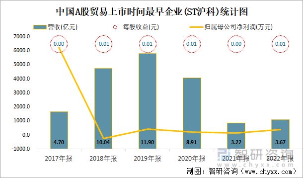 2022年报中国A股贸易上市公司中,截至2023年5月31日,1992年3月27日上市的ST沪科上市时间最早距今约31年,从近几年年报营收与净利润来看,2019年报营收最高,有11.9亿元,2018年报归属母公司净利润亏损。