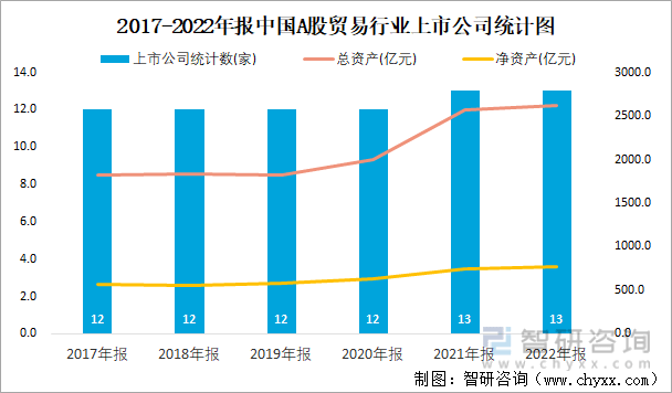 截至2023年5月31日,2022年报贸易共有13家A股上市公司披露数据,总资产为2619.84亿元,净资产为774.17亿元。13家上市公司分布在5个省级行政区,其中江苏上榜企业最多,有6家,与上年数量一致。
