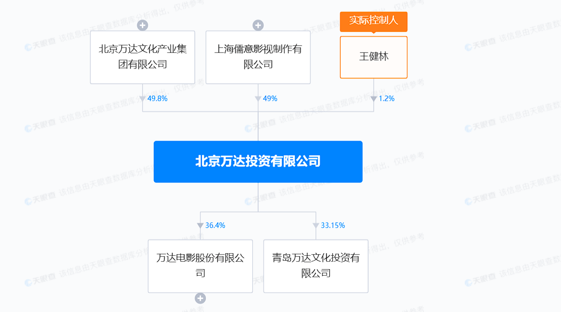 天眼查App显示,近日,北京万达投资有限公司发生工商变更,新增上海儒意影视制作有限公司为股东,持股49%。目前,该公司由北京万达文化产业集团有限公司、上海儒意影视制作有限公司、王健林分别持股49.8%、49%、1.2%。