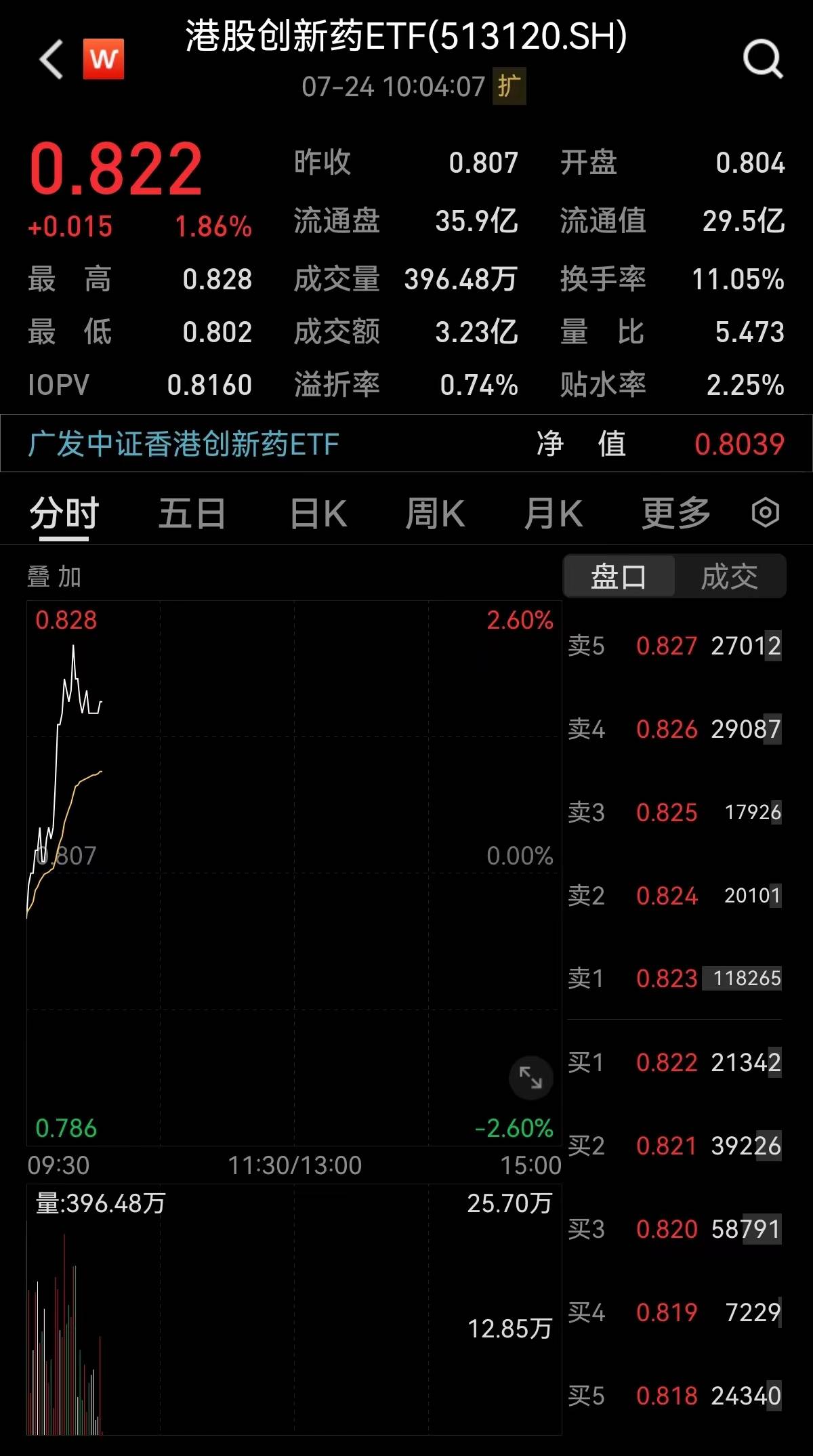 截至10:04,港股创新药ETF(513120)早盘快速拉升现涨1.86%,连续两天上涨,成交额超3.23亿元。市场交投活跃,成交额持续扩大。