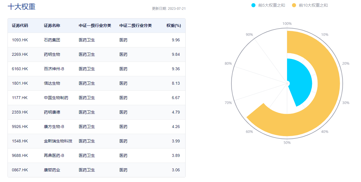 截至2023年7月21日,中证香港创新药指数前五大权重股(包括石药集团、药明生物、百济神州、信达生物、中国生物制药)占比之和达43.97%,前十大权重股占比之和达62.96%。(数据来源:中证指数公司,指数成份股不代表个股推荐)