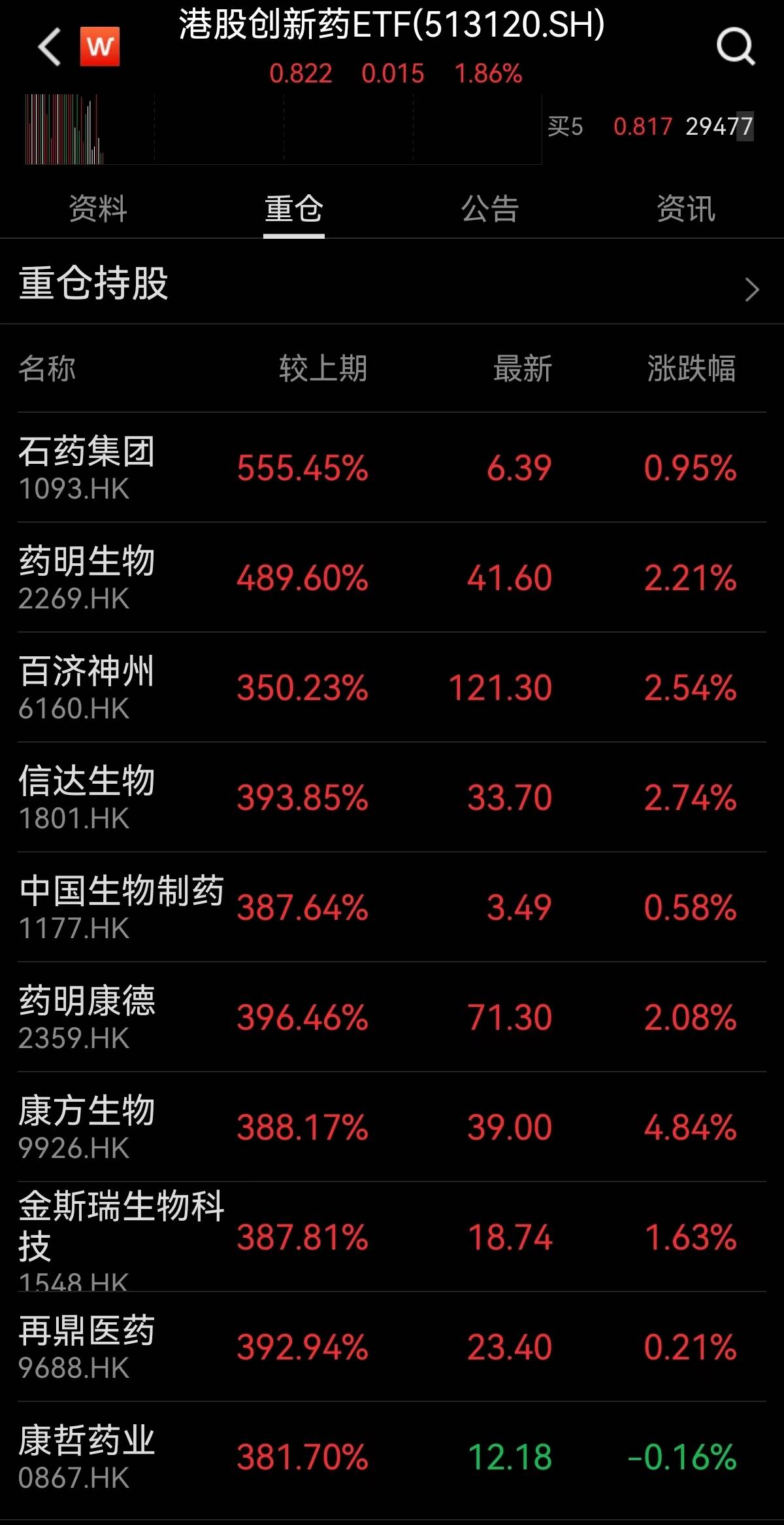 港股创新药ETF(513120)前十大权重股中,康方生物涨超4%,信达生物、金斯瑞生物科技、百济神州、药明康德、药明生物涨超2%,石药集团等个股跟涨。