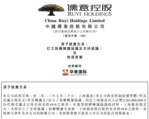 公告显示,7月20日,上海儒意(中国儒意的受控制结构实体)作为受让方与北京万达文化产业集团有限公司(“北京万达文化”)订立了股权转让协议,约定上海儒意以人民币22.62亿元受让北京万达文化持有的北京万达投资有限公司(“北京万达投资”)49%的股份。