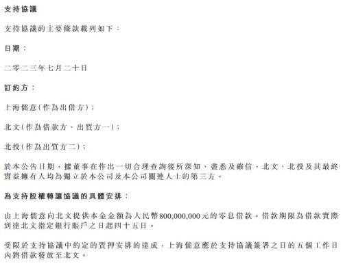 除了签署股权转让协议,上海儒意还与北京万达文化、北京万达投资订立了支持协议,由上海儒意向北京万达文化提供本金金额为8亿元的零息借款,借款期限为借款实际到达北京万达文化指定银行账户之日起45日。