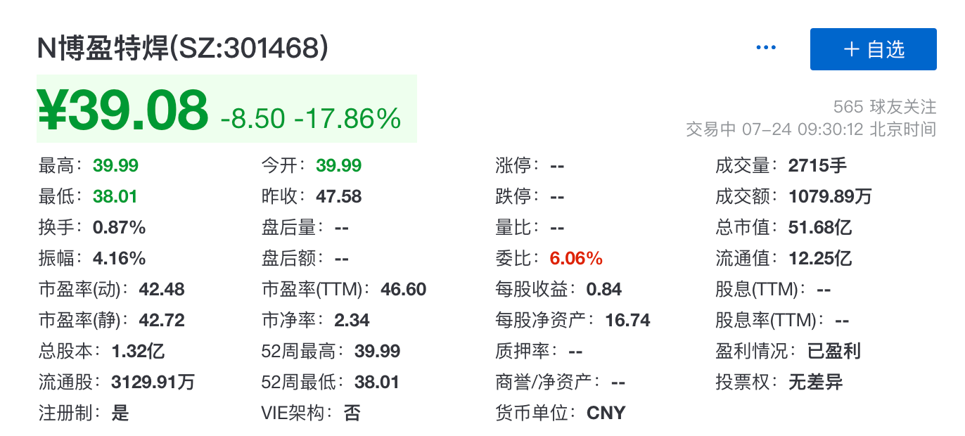 截止9:30,博盈特焊下跌17.86%,报39.08元每股,总市值为51.68亿元。