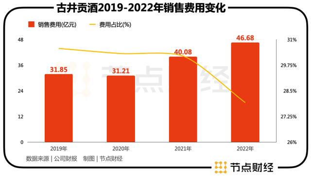 其实,这个问题古井贡酒一直在努力解决。2022年,其销售费用为46.68亿元,费用占比为27.93%,已经有了明显下降。而且,同期毛利率和净利率也都有了明显改善。