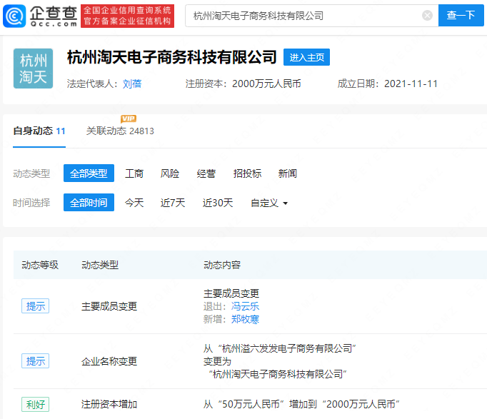 企查查APP显示,7月20日,杭州溢六发发电子商务有限公司发生工商变更,企业名称变更为杭州淘天电子商务科技有限公司,同时注册资本由50万人民币增至2000万人民币,增幅3900%。