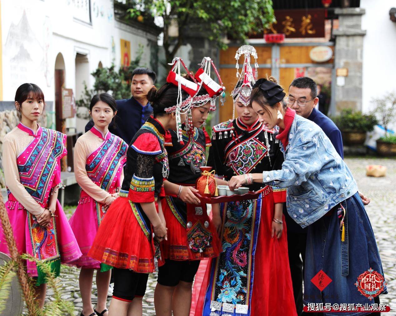 (图说:畲族婚礼上,幸福惊喜官张歆艺和伴娘们准备“拦门酒”)
