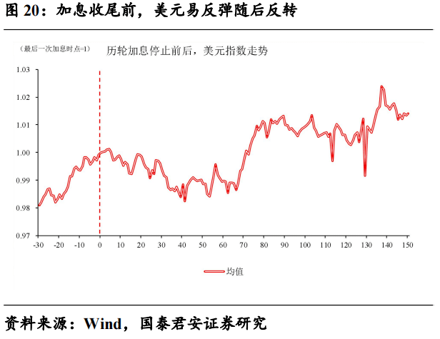 再结合加息收尾窗口期,我们认为美元指数可能反弹到104左右,随后重回下行通道。如果美联储7月议息会议为加息终点,根据历次加息收尾阶段美元指数的表现来看,加息收尾前,美元指数往往趋于上行,因此我们认为美元指数可能反弹到104左右。但加息收尾后,美元指数普遍在40个交易日(大约2个自然月)内平均下跌1.5%左右。