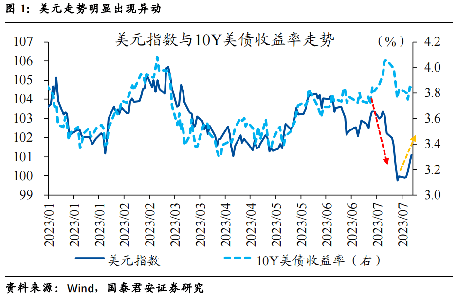 近期美元走势明显出现异动,先是快速跌破100,随后又反弹101以上。2023年7月6日起,10年期美债收益率及美元指数双双下行,前者从4.06%的高点下破至3.76%,后者从103.4的高位快速跌至99.6。7月17日后,美元指数迎来反弹,重新回到101以上,10年期美债收益率也回到3.85%以上。