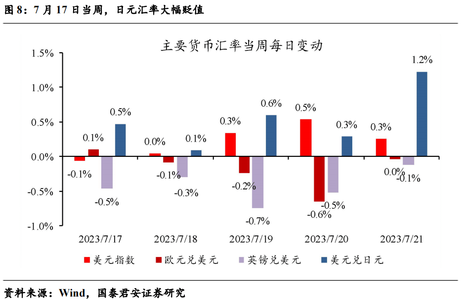 近期美元的反弹,除了欧元回落以外,日元的快速贬值也是重要推动。日本6月份整体CPI同比上涨3.3%,略高于前值和预期的3.2%,连续15个月高于央行目标,但也是2022年1月以来首次放缓。先前通胀压力的持续释放,市场对日本央行货币政策转向的预期越发升温,认为后续有可能对YCC(收益率曲线控制)政策的宽松立场发生松动,利多日元。但近期日本央行官员对日本金融市场的总体评估仍然保持不变,收益率曲线的形状依然平稳,市场没有任何重大问题的迹象,引发了市场对日本央行政策立场转向预期的降温,带动日元贬值、美元指数上行。