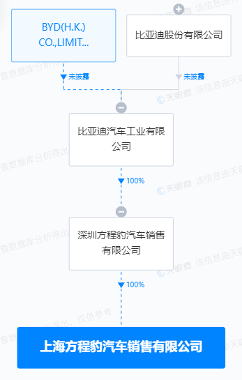 天眼查App显示,近日,上海方程豹汽车销售有限公司成立,法定代表人为付振兴,注册资本100万人民币,经营范围包括汽车销售、新能源汽车整车销售、汽车零配件零售、二手车经纪、机动车鉴定评估、停车场服务等。股权全景穿透图显示,该公司由深圳方程豹汽车销售有限公司全资持股,后者为比亚迪汽车工业有限公司全资子公司。