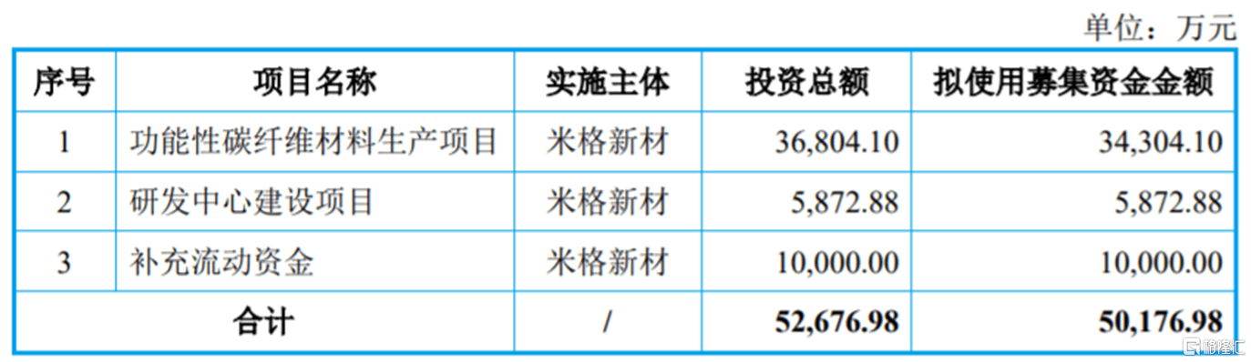 本次申请上市,公司拟募集资金用于功能性碳纤维材料生产项目、研发中心建设项目、补充流动资金。