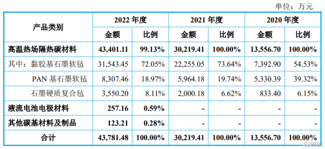 报告期内,米格新材主要聚焦于高温热场隔热碳材料领域,主要产品包括黏胶基/PAN基石墨软毡、石墨硬质复合毡等,广泛应用于光伏晶硅制造热场、半导体热场、粉末冶金热场等场景。其中黏胶基石墨软毡的营收占比在50%以上,是公司的重要收入来源。