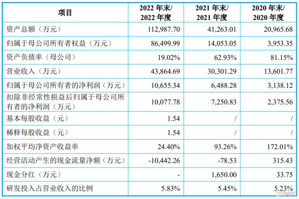 招股书显示,2020年至2022年,米格新材的营业收入分别约1.36亿元、3.03亿元、4.39亿元,归属于母公司所有者的净利润约为0.31亿元、0.65亿元、1.07亿元。