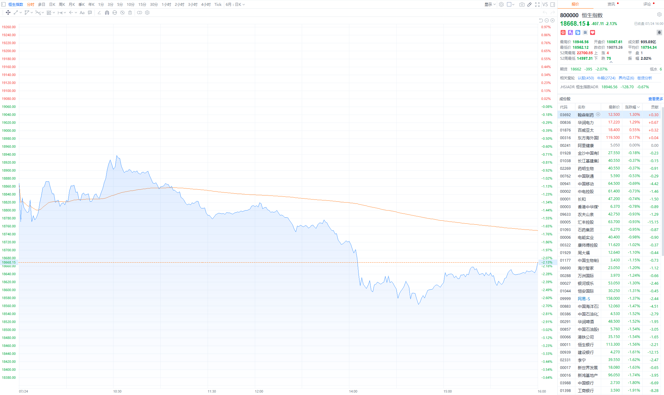 【香港恒生指数收跌2.13% 恒生科技指数跌2.18%】财联社7月24日电,香港恒生指数收跌2.13%,恒生科技指数跌2.18%。碧桂园服务跌超17%,龙湖集团跌超8%,融创中国跌超7%,赣锋锂业跌超5%,天齐锂业跌超4%;零跑汽车、蔚来涨超2%。