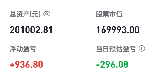 金融界7月24日消息胡锡进发布炒股心得。胡锡进表示今天大盘又是绿的,我个人跟着绿,账面亏损296元。